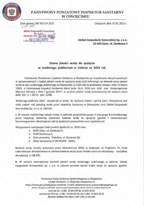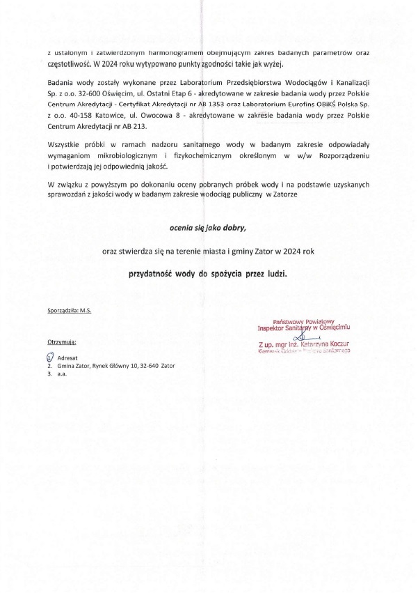 Państwowy Powiatowy Inspektor Sanitarny w Oświęcimiu, po rozpatrzeniu danych zawartych w sprawozdaniach z badań jakości wody do spożycia przez ludzi, dokonał oceny jakości wody. W badanym zakresie wodociąg publiczny w Zatorze ocenia się jako dobry oraz stwierdza się na terenie miasta i gminy Zator w 2024 roku, przydatność wody do spożycia przez ludzi.